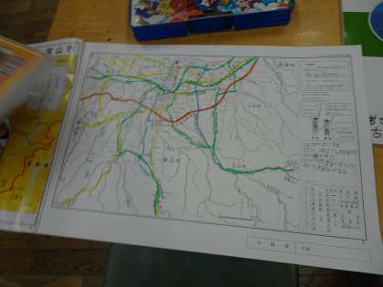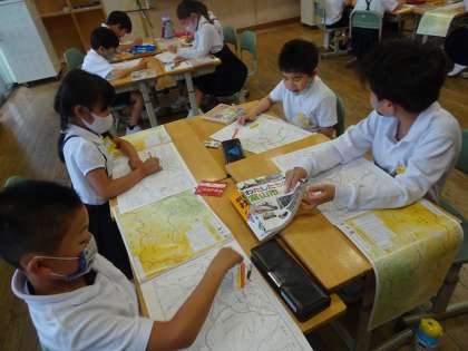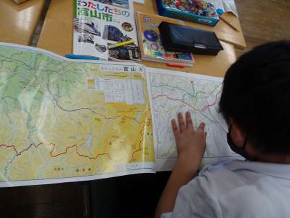 社会科では、自分たちの学校の位置や富山市のいろいろな乗り物、公共交通機関などについて学習を進めています。今日は、これまでのことを思い出しながら、白地図に色を塗りました。岩瀬小学校の周りの様子を言葉で表現したり、グループの友達と国道や北陸自動車道、鉄道を確かめながら色を塗ったりしました。