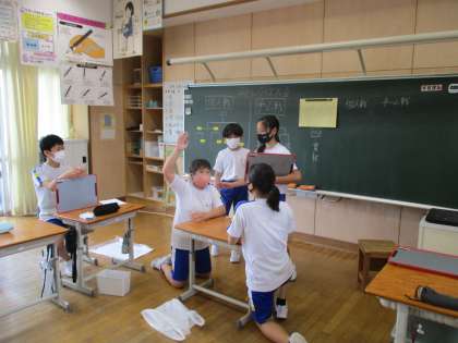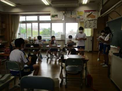 係活動で、学習係が作成したクイズに、クラス全員で臨んでいます。5年生の復習の問題や、6年生で習ったことなど、様々なジャンルで問題が出題されました。