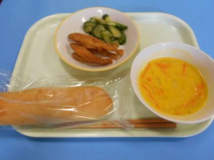「コッペパン、わかさぎのフリッター、グリーンソテー、かぼちゃポタージュ」でした。(全て加熱処理し、予定していたサラダ、フルーツゼリーミックス、牛乳の提供は、念のため取りやめました。)