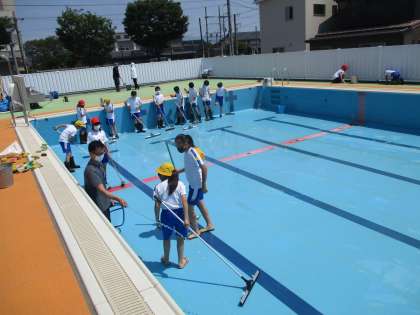 先週金曜日に引き続き、プール清掃を行いました。今回は、プールの床をブラシ等で磨くことを中心に行いました。5・6年生の子供たちが一生懸命取り組んでくれたおかげで、とてもきれいになりました。プール学習が楽しみです!