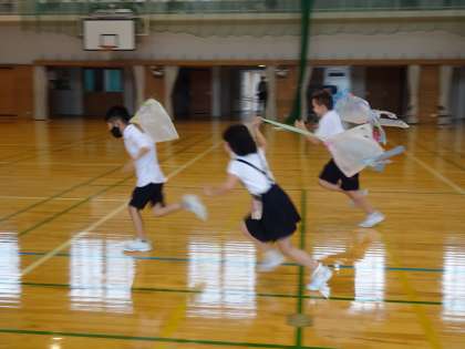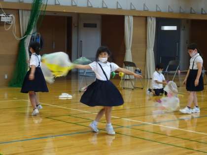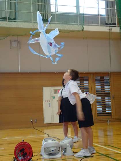 図画工作科「ふき上がる風にのせて」の2回目の学習を行いました。自分の作ったものを飛ばしたり膨らませたりしようと、送風機をいくつもくっつけて風の強さを工夫したり、手で持って回ったり、走ったりと、友達と楽しく活動することができました。