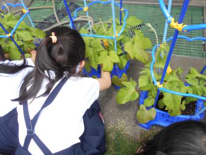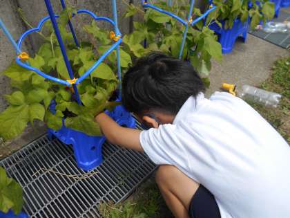 あさがおが大きくなり、追肥をあげました。「もっと大きくなるために、栄養をあげるんだね。」とより成長が楽しみになりました。
