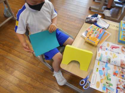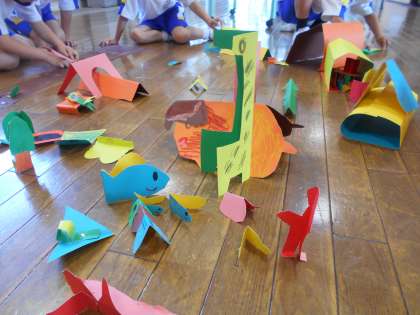 図画工作科の時間に画用紙を折って、立ててみました。「ライオンの形に見えるね。」「本屋をつくろう。」「道路に車を走らせよう。」と1年松組の廊下に街を作りました。画用紙を立てるために、 バランスを考えて折っていました。動物や建物が溢れる街になりました。