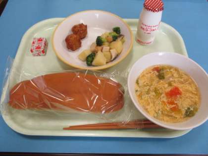 「米粉コッペパン、ミートボール、ひよこ豆のオリーブオイル炒め、卵とレタスのスープ、ポケットチーズ、飲むヨーグルト」でした。