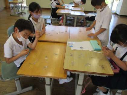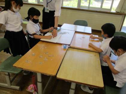 2年生が算数で、たくさんのクリップの数を数えています。班ごとに、どうやったら簡単に、確実に数を数えられるか、考え、相談しました。「こんなにたくさんのクリップを数えるのはむりだ!」「10ごとにつなげると分かりやすいかも」分けて数えて、ノートに筆算をする班も見られました。