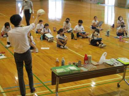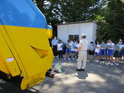 4年生が「3R推進スクール」を体験しました。まず、市役所の方から、リサイクルやゴミの出し方などを教えていただきました。その後、本物のゴミ収集車を見せていただきました。