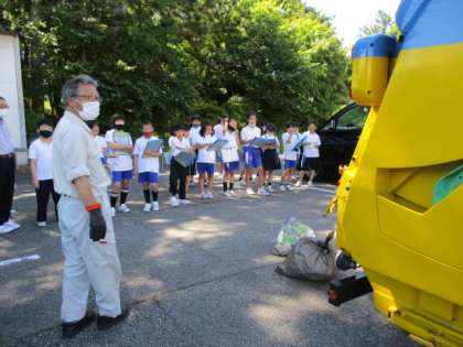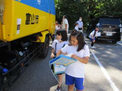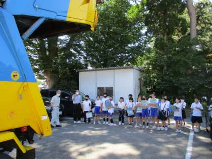 ごみ収集車の後ろが開いたりごみを入れたりする様子を見せてもらいました。「収集車が来てくれるおかげで、わたしたちがごみを出せるのだね」「燃えるごみの日に、燃えないごみを出さないようにしよう」家庭でのごみの出し方やリサイクルを守ろうという思いを強くした4年生でした。