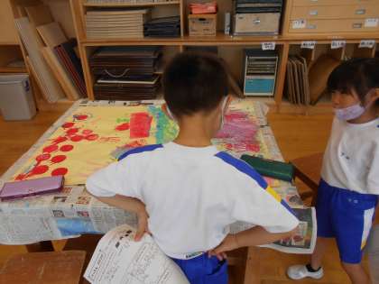 模造紙いっぱいに楽しんだ作品をお互いに見合いました。友達の作品を見て「森みたいだね」「オーロラみたいだ」と鑑賞しました。