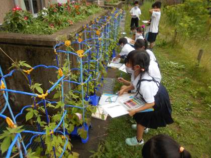 今日は2人のあさがおが咲きました。それぞれの花の色が違うのを見て、「なんでだろう。」「わたしのは何色が咲くかな。」とお話をしていました。