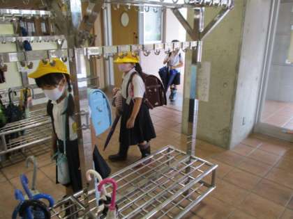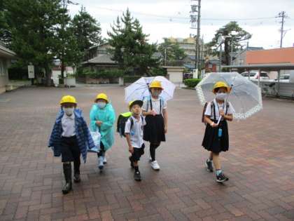 今週は雨が続いています。傘やカッパを着用しながら登校する子供たち。8:10には児童全員入りました。皆出席16日目です。