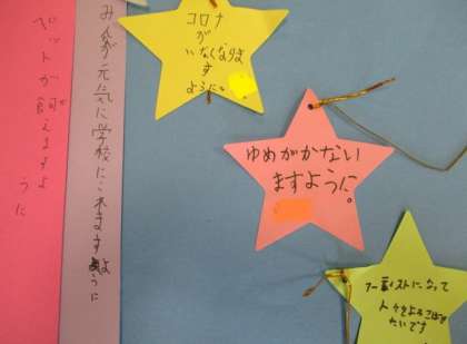 職員室前の小さな七夕に、子供たちが願い事を書いて飾りました。昨年同様「早くコロナが終わりますように」という文がある一方、昨年より「〜したい」「〜になりたい」という前向きな希望や夢を飾る子供が増えたことは喜ばしいことです。