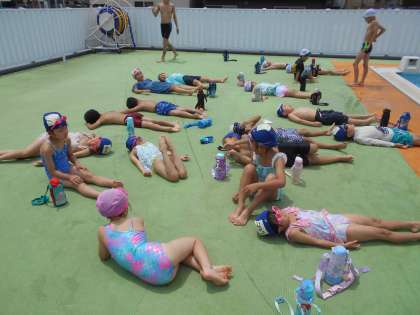 3時間目の時間は、太陽が出て気温もグッと上がりました。数日続いた雨でプールの水は冷たかったですが、2年生と気持ちよく泳いだり、宝探しをしたりすることができました。