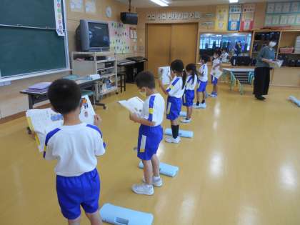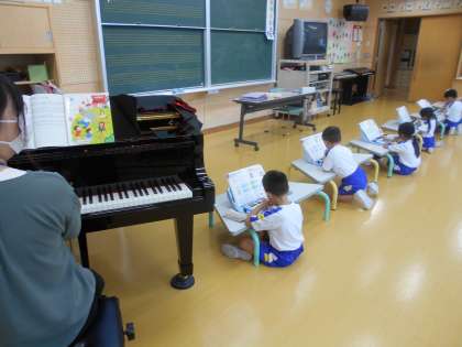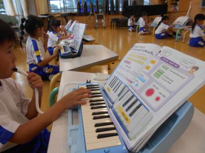 音楽科の時間では、ピアニカで演奏をしています。5本の指で、「ドレミファソ」まで演奏できるようになりました。また、初めて音楽の時間に歌った歌をもう一度歌いました。4月の頃と比べて、歌う姿勢も歌声もはな丸でした。