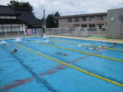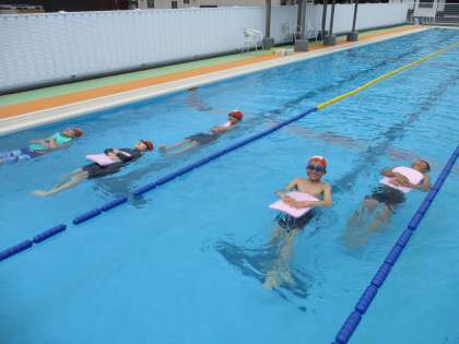 今日のプール学習は背泳ぎを中心に行いました。まずはビート板を抱えて浮く練習から始めて、そこから子供たちのレベルに合わせて取り組んでいます。