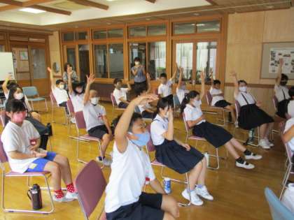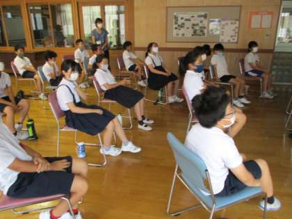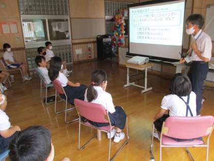 市教育センターから講師の先生に来ていただき、「情報モラル講座」を行いました。SNSの使い方や危険、オンラインゲームや動画での注意などを事例も聞きながら学びました。先生に「インターネットやラインなどを使っている人?」と聞かれると、ほぼ全員が手を挙げた5年生。約1週間後の夏休みをひかえ、ご家庭でも、ネットやオンラインゲーム、SNS等の使い方にご注意いただき、約束を決めるなどのご指導をお願いします。