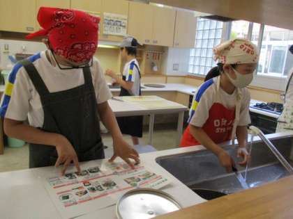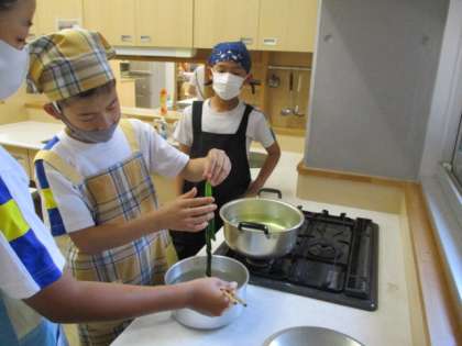 5年生が家庭科で、じゃがいもやほうれん草をゆでました。班で協力して、野菜を切ったりお湯をわかしたりしました。「ジャガイモをゆでる時、最初は強火かな」「5cmってこれくらい?」など、相談しながら調理する動画クリック→5年調理実習1 クラスを2回に分けて、あとの子供は、あさって15日に行います。