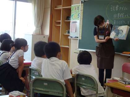 朝の読書タイムに図書館から読み聞かせに来ていただきました。