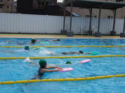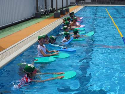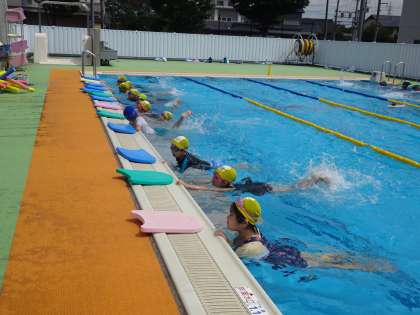 バタ足の練習やビート板を使って体を浮かせる練習をしました。最後には、ビート板を使ってプールの端から端まで泳ぐ(難しい場合は、歩いてもOK)ことを楽しみました。