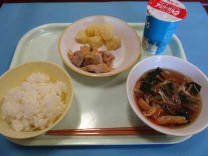 「あっさりチキン、こふきいも、さわにわん、ごはん、飲むヨーグルト」でした。献立を紹介する給食委員会の動画クリック→献立紹介