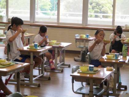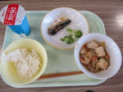 1学期最後の給食は「ごはん、韓国風すき焼き、いわしのきしゅう煮、きざみあえ、飲むヨーグルト」でした。今日もおいしく、安全に食べることができました。2学期の給食は8月30日(月)からです。