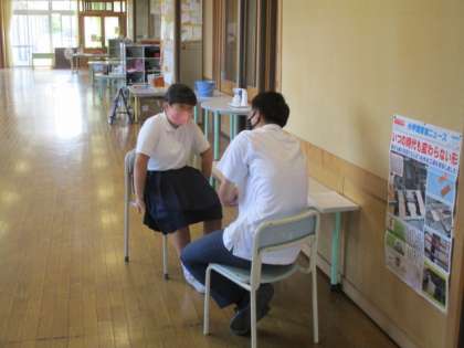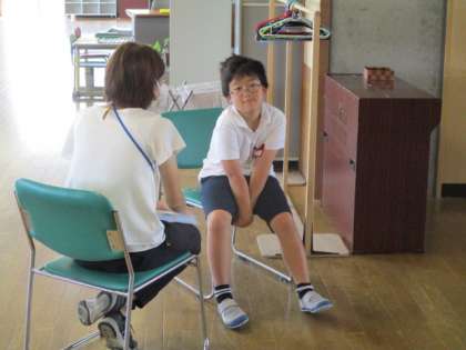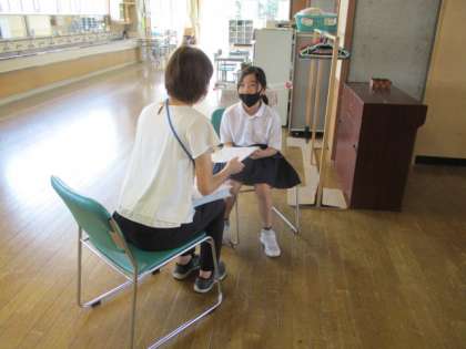 あゆみをもらう5・6年生。担任は一人一人の成長や努力を認め、声をかけ、子供はうれしそうに恥ずかしそうに聞いています。