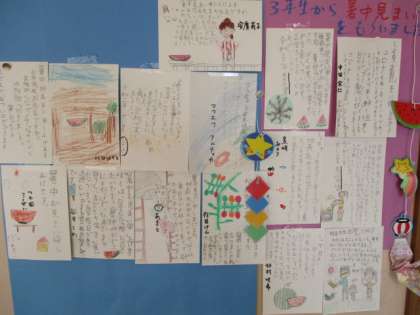 「3年生の何人かから、暑中見舞いをもらいました。ありがとう。登校日が中止になって会えないのがさびしいですが、8月27日始業式に、元気なみんなから夏休みの思い出を聞くのを楽しみにしています。」