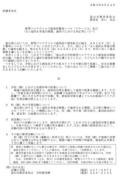 富山市教育委員会より、『新型コロナウイルス感染症警戒レベル「ステージ3」及び「まん延防止等重点措置」適用下における対応等について』の通知がありました。また、『富山市立学校新型コロナウイルス感染症対策検討会議だより VOL.12』が届きました。配付文書にも掲載しましたので、ご覧ください。なお、紙媒体での配付は始業式の日に行います。