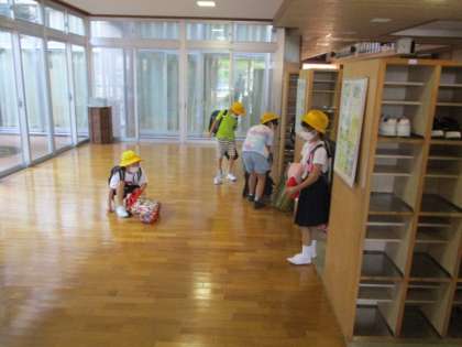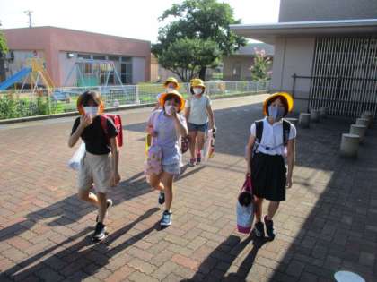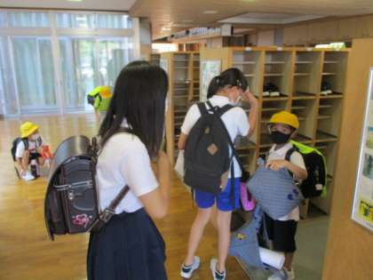 2学期が始業しました。残暑厳しい朝、子供たちが、夏休みに仕上げた作品など多くの荷物を持って登校してきました。