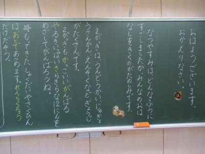 放送で始業式の話を聞いた後、各学級で活動が始まりました。まずは、持ってきた夏休みの宿題や作品を提出します。黒板には、担任から2学期初めの励ましの言葉が記されています。