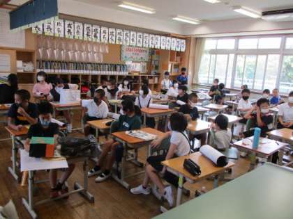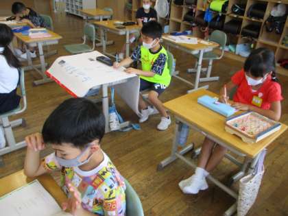 作品や自由研究に付けるカードに、自分の名前や題名を書く子供たち。一人一人の思いや努力、頑張りが感じられます。保護者の皆様も、ご指導や励ましをいただき、ありがとうございました。