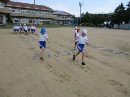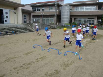 3年生の体育が始まりました。まずは体慣らしとして、グラウンドでミニハードル走をしました。スタートや跳び方に気を付けて、走る・跳ぶ力を高めます。ミニ動画クリック→3年ミニハードル走