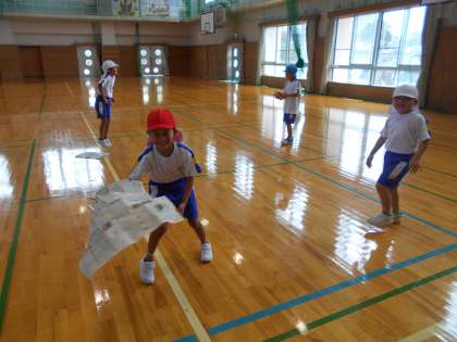 体育では、体に張り付いた新聞紙が落ちないように全力で走りました。また、友達が受け取りやすいように新聞を投げたり、思い切り体を動かして新聞を受け止めたりしました。