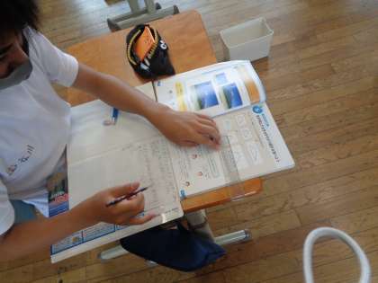 算数科では、形は同じだけど、大きさが異なる図形を、定規や分度器を使って調べています。ノートには子供たちの気付きを書き込んでいます。
