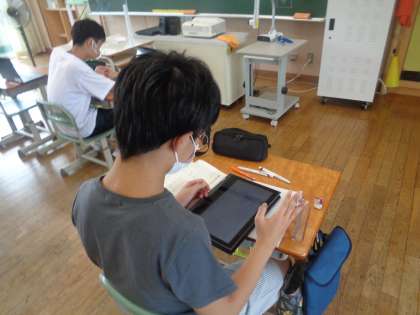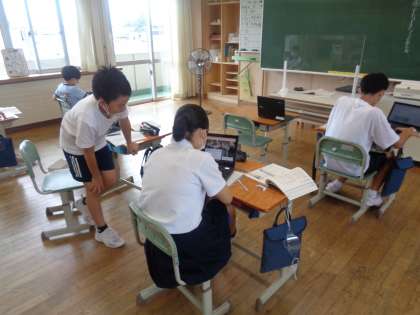 国語科では、三文字の熟語の意味についてクロムブックや国語辞典を使い、調べています。分からないことは友達同士で教え合っています。