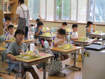 「今日の献立は、ごはん、大根の味噌煮込み、いわしのしょうが味、コーンあえ、牛乳、冷凍パインでした。」と紹介する木曜当番児童と、その放送を聞きながらおいしく食べる2年生。