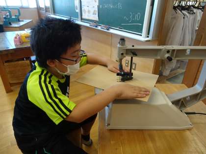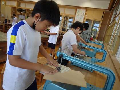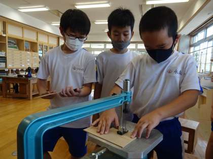 図画工作科の学習で、初めて電動糸のこぎりを使って板を切りました。正しく安全な使い方に気を付けながら作業をしました。直線や曲線を思うように楽しそうに切ることができるようになりました。
