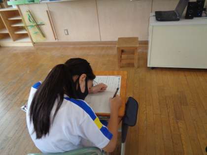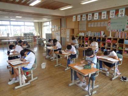 国語科(書写)では、文字のつながりを大切にして、文字を書く練習をしています。書いている時は、とても真剣に書く姿が見られました。