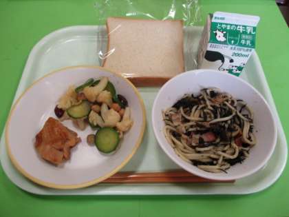 「食パン、ベーコンとひじきの和風スパゲッティ、照り焼きチキン、ビーンズサラダ、牛乳」でした。ミニ動画→献立紹介の放送