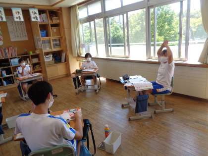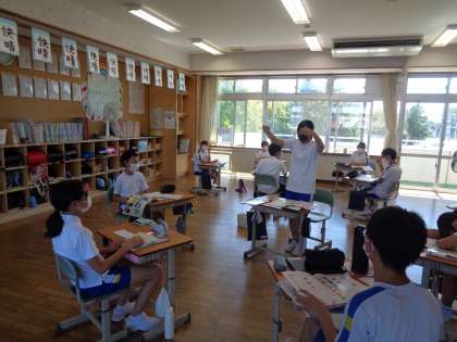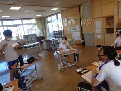 外国語科では、自分の夏休みの思い出を、友達に英語で伝えています。ジェスチャーを大切にして表現豊かに伝えることをねらいにしています。