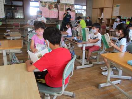 国語科で、海の生き物がどのようにかくれているか、読んで確かめています。全校の先生が参観する校内研修会でしたが、臆することなく張り切って音読や発言をする1年生です。