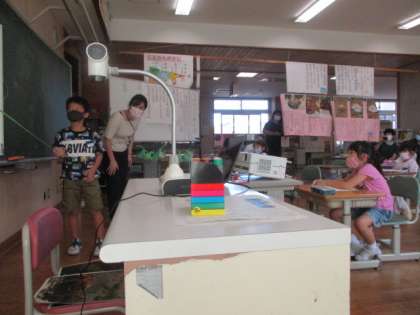 国語科で、海の生き物がどのようにかくれているか、読んで確かめています。全校の先生が参観する校内研修会でしたが、臆することなく張り切って音読や発言をする1年生です。
