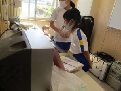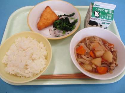 「ごはん、肉じゃが、はんぺんフライ、ゆかりあえ、牛乳」でした。給食時の校内放送では、「朝のあいさつがよかった人」紹介や、2・6年児童へのインタビューなどがされていました。