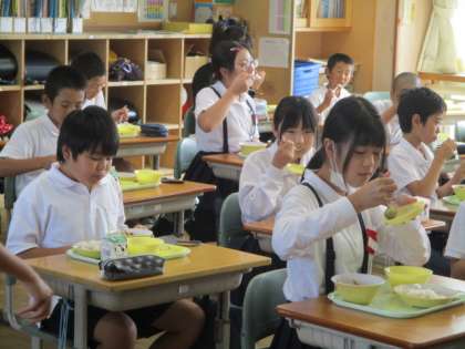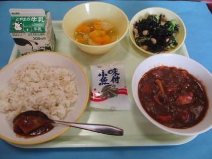 今日の献立は、「麦ご飯、食べキリンハヤシ、大豆とひじきのサラダ、フルーツゼリーミックス、味付け小魚、牛乳」でした。