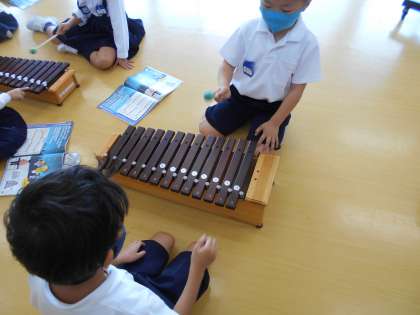 「きらきら星」を木琴で演奏しました。1学期に鍵盤ハーモニカで演奏していた曲を違う楽器で演奏するのが楽しかったようです。「音が変わると、(鍵盤の)長さが変わるね。」「下に長いものがついているよ」と楽器の観察もしました。