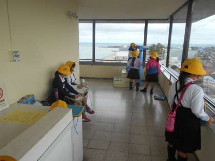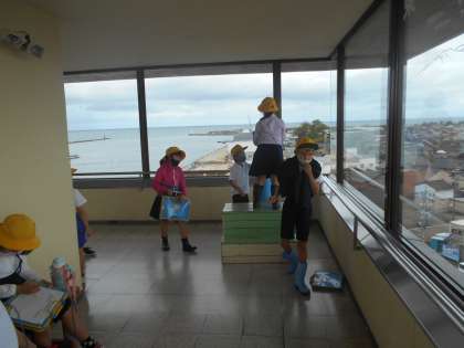 今日は展望台に上りました。朝から雨が続いていましたが、町探検の前には、雨も上がり、行くことができました。たくさんの発見があった楽しい町探検になりました。