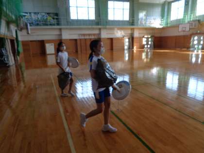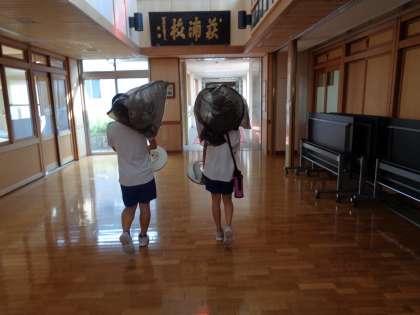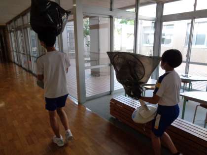過ごしやすい気候になってきたため、6年生が各教室の扇風機を集め、体育館に片付けています。「全校のために、動いてくれてありがとう」