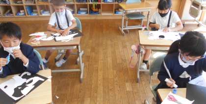 今日の図工の作品は、はさみをつかって作品を作りました。白い紙を切ってできた形を置き方を工夫して黒い紙に貼りました。子供たちは、はさみで色々な形に切りながら楽しく学習に取り組んでいました。