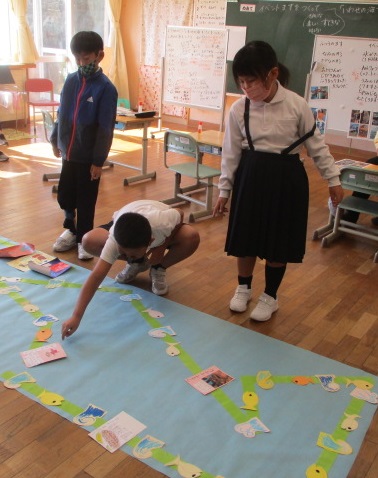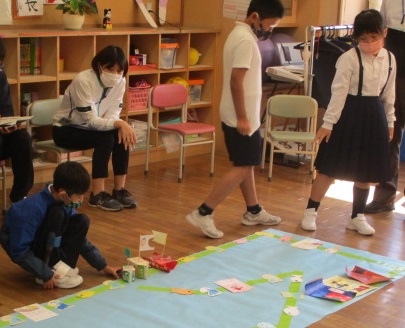 岩瀬の海や漁港をイメージした大きな「すごろく」を作っています。「お父さんがブリを大漁にとったよ。7マス進もう」「燃料がなくなったら船はスタートに戻るよ」家族の仕事を知っている桃組の子供らしい、くわしく楽しいすごろくができそうです。