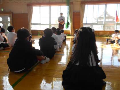 5時間目は、気持ちのよい天気だったので、学校内にあるどんぐりの木を探しに行きました。クヌギの木の下には、太くて丸いどんぐりがありました。どんぐりの帽子を見て、「暖かそうだね。」と話をしていました。