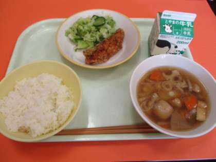 「ごはん、魚のたつた揚げ、そえ野菜、こんさい汁、牛乳」でした。